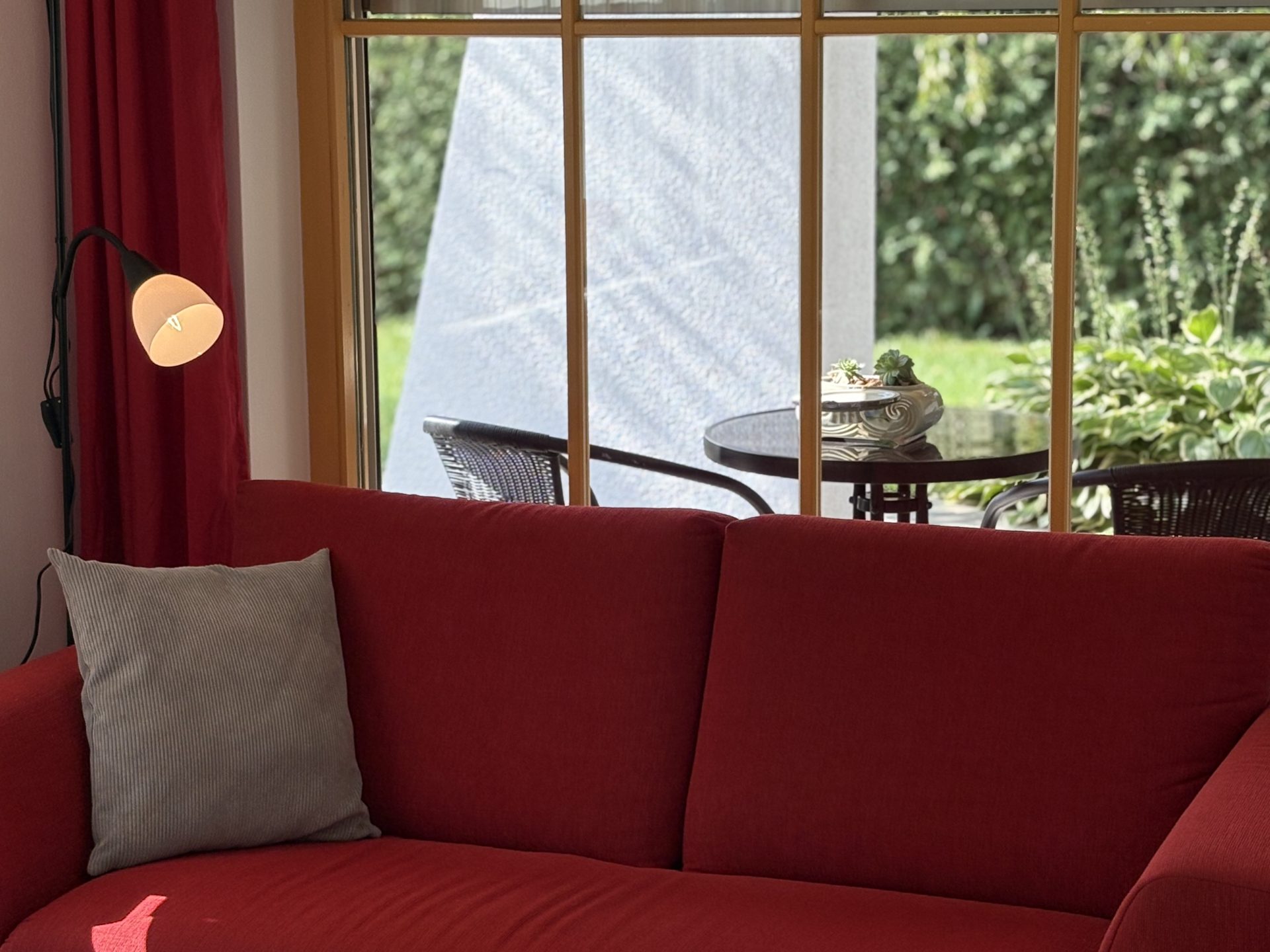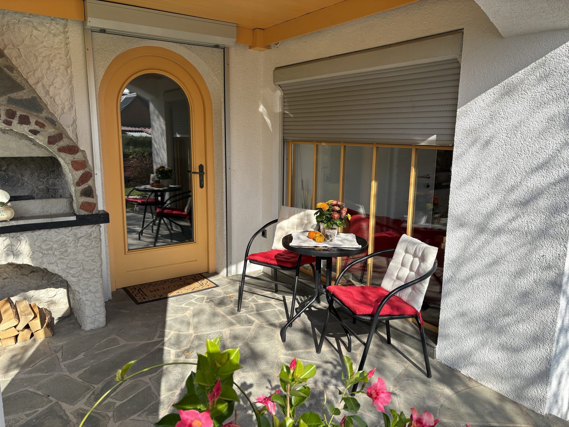 Vor dem Eingang befindet sich eine kleine überdachte Terrasse mit Sitzgelegenheit, um den ereignisreichen Tag bei einem Glas südsteirischen Wein gemütlich ausklingen zu lassen. Entspannen und die Füße hochlegen kann man auch gerne im angrenzenden Garten.