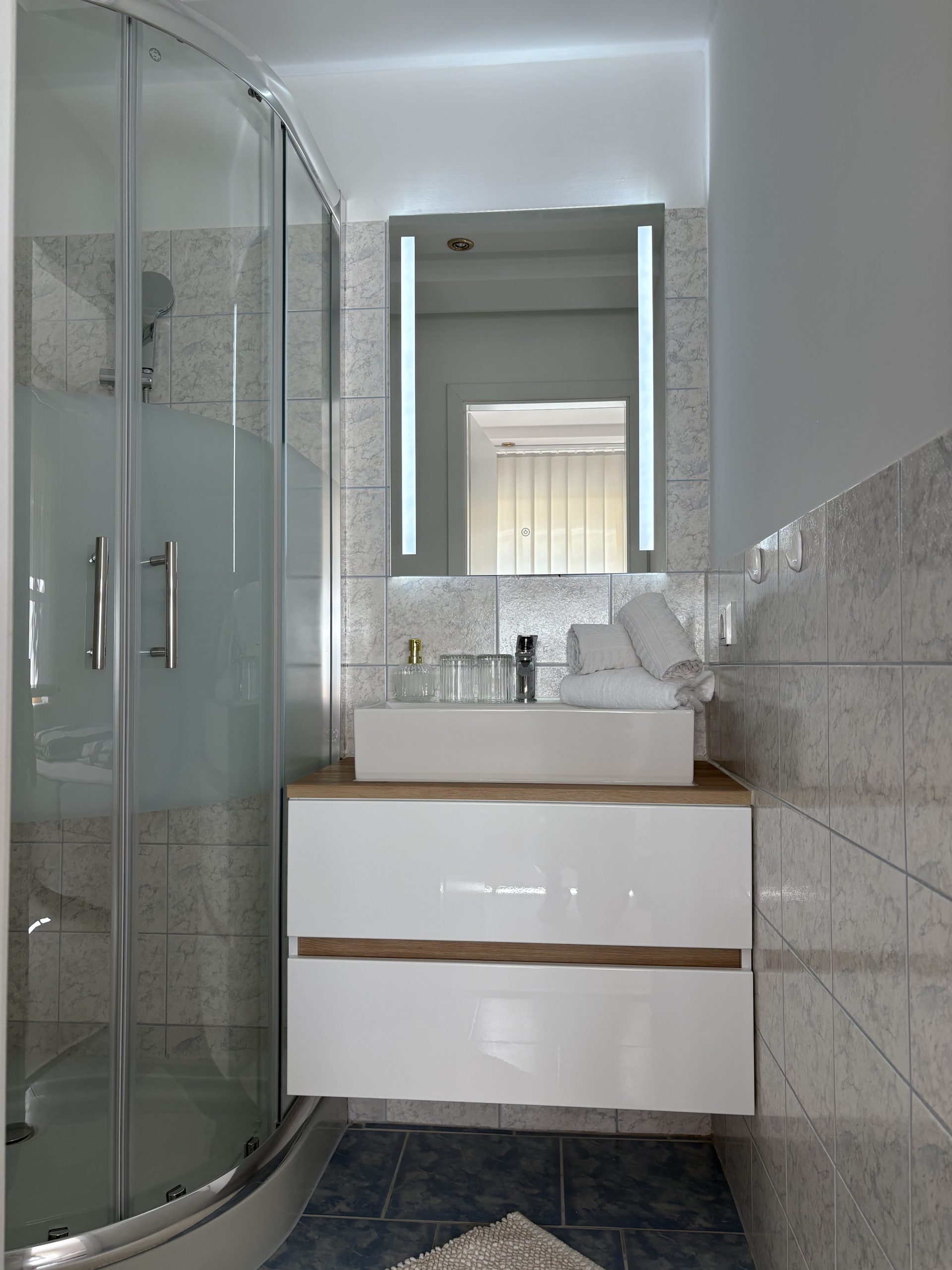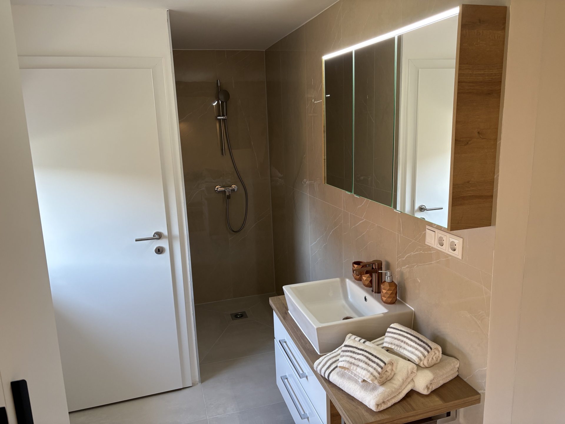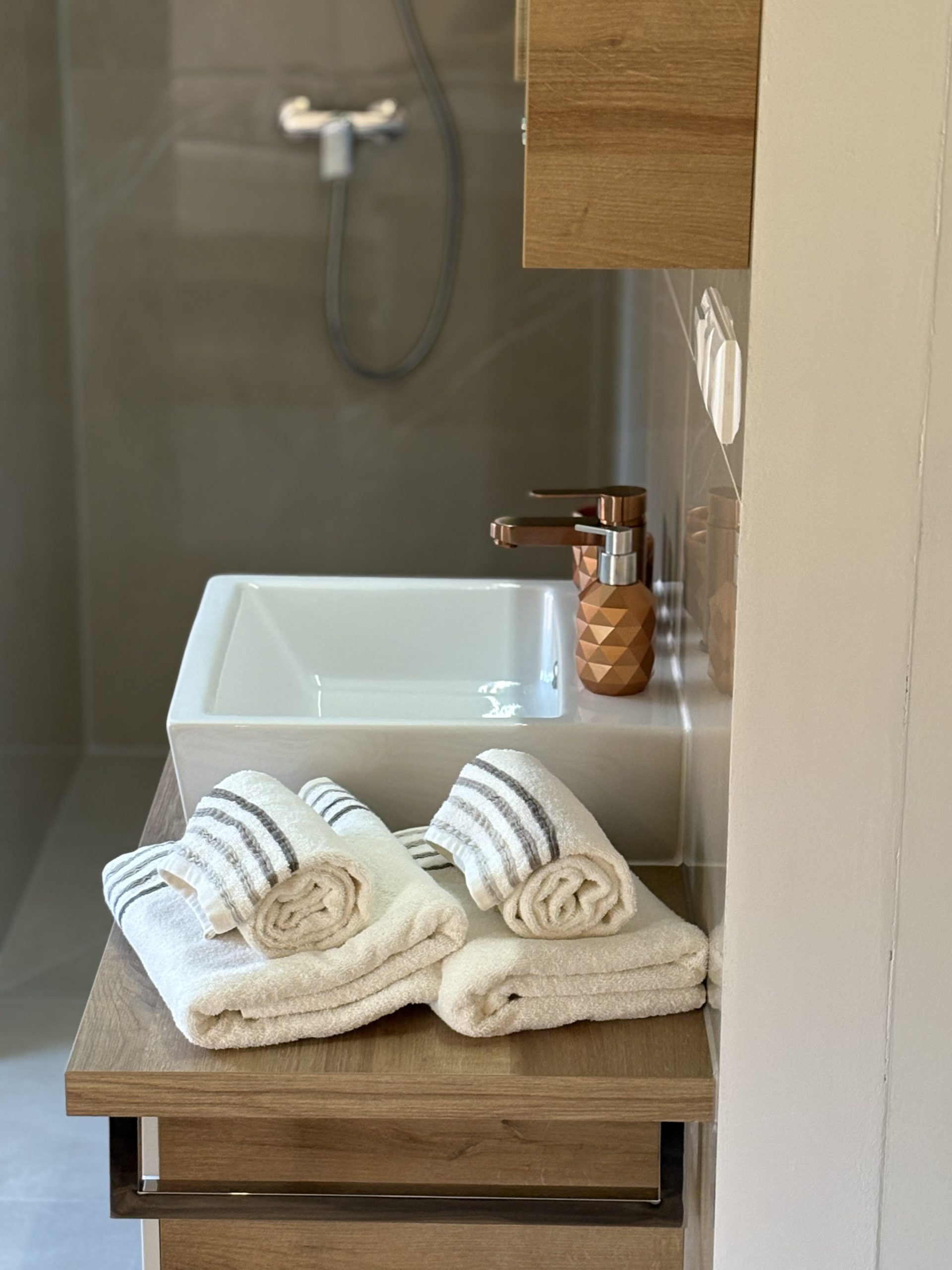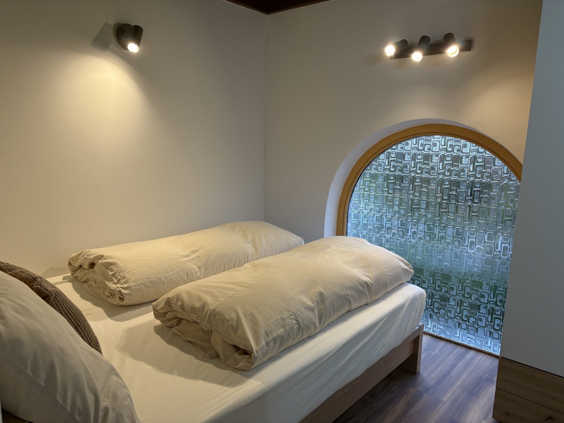 Zusäzlich verfügt die Ferienwohnung noch über ein 2tes kleines gemütliches Schlaftzimmer mit einem eigenen offenen Badezimmer (begehbare Dusche/Waschbecken) und einem getrennten WC.