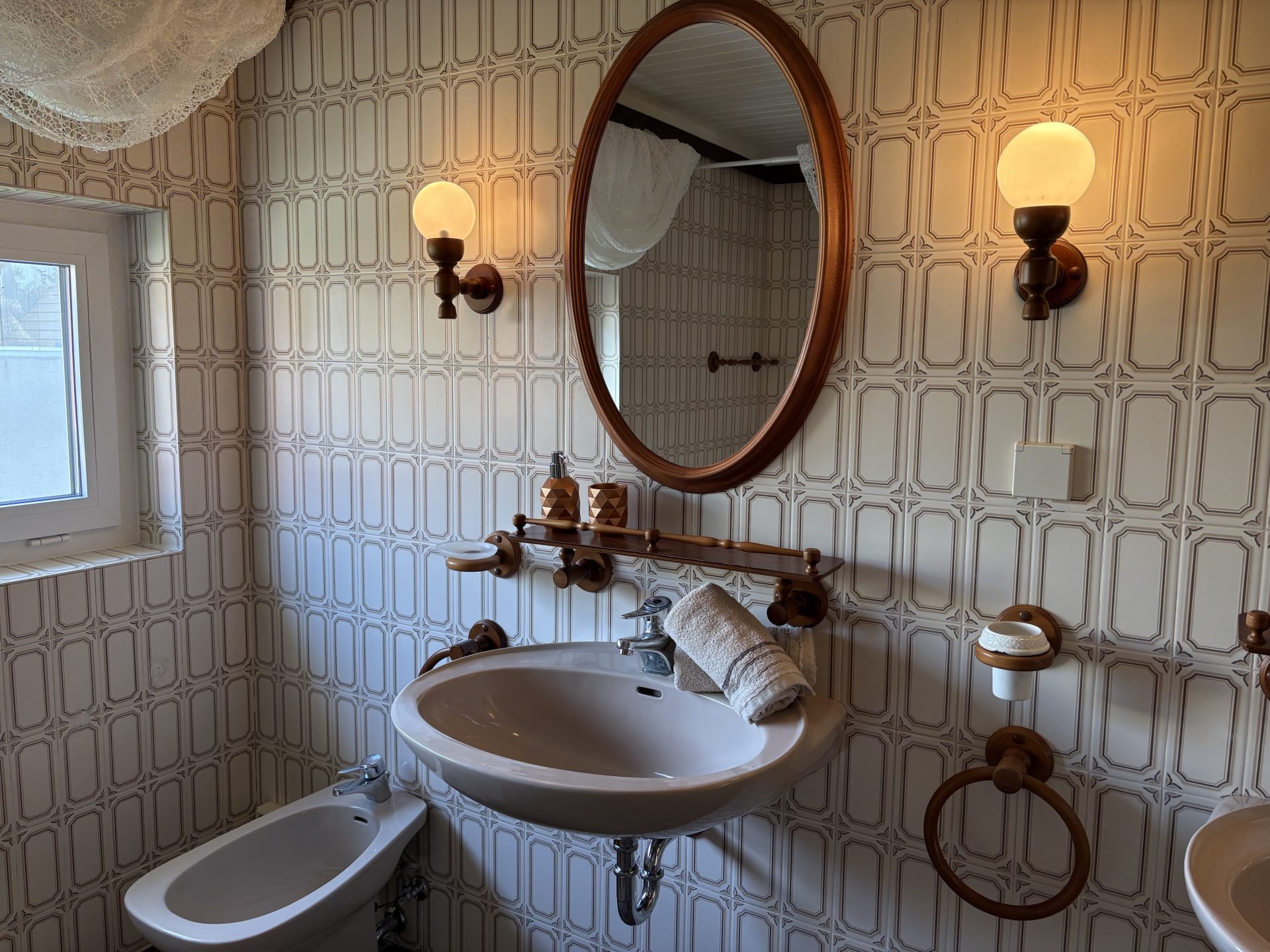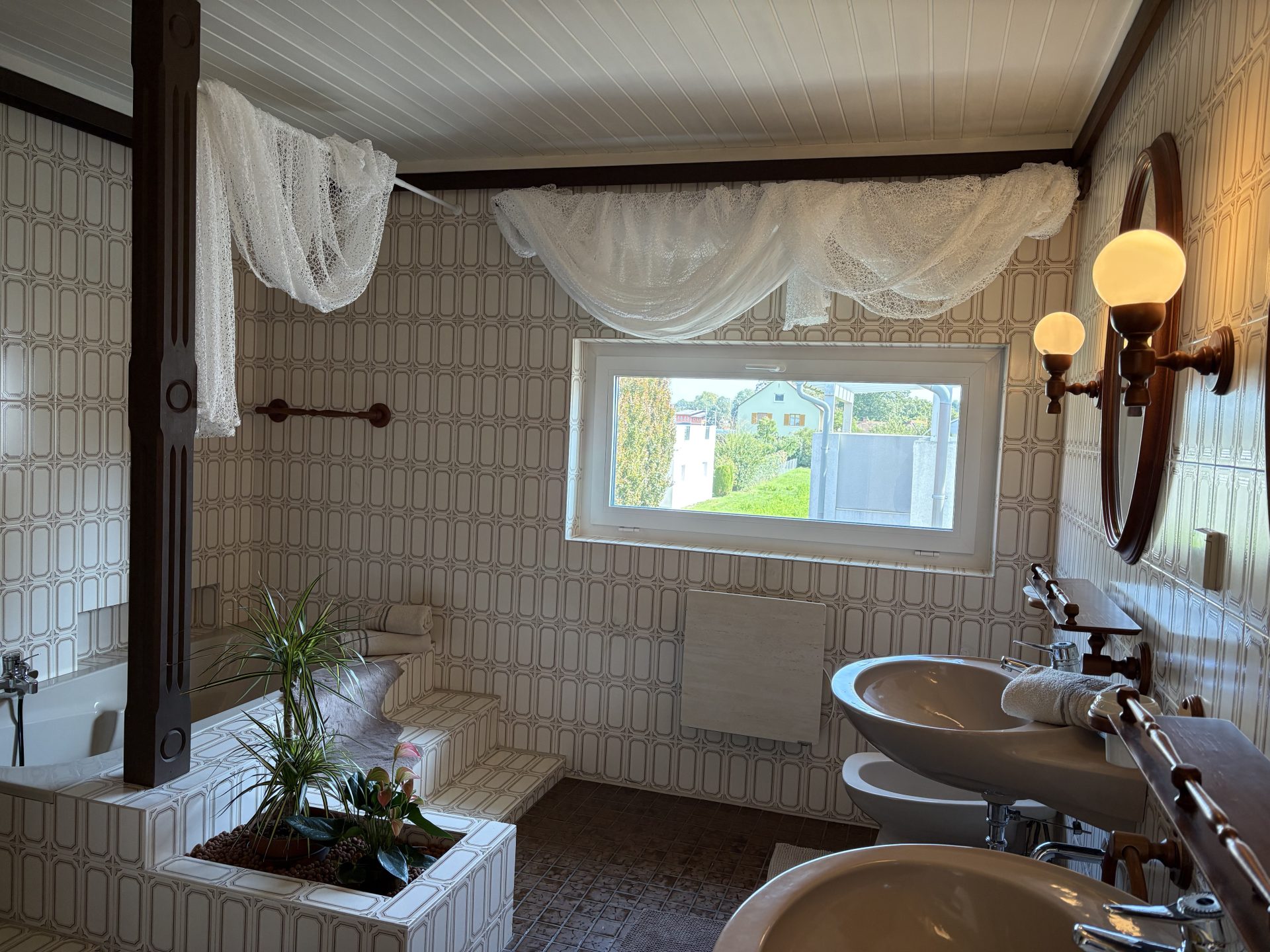 Weiters gibt es ein charmantes Schlafzimmer, ein großzügiges Badezimmer mit viel Freiraum (2 großen Waschbecken, Dusche, Badewanne und Bidet) und einem getrennten WC.